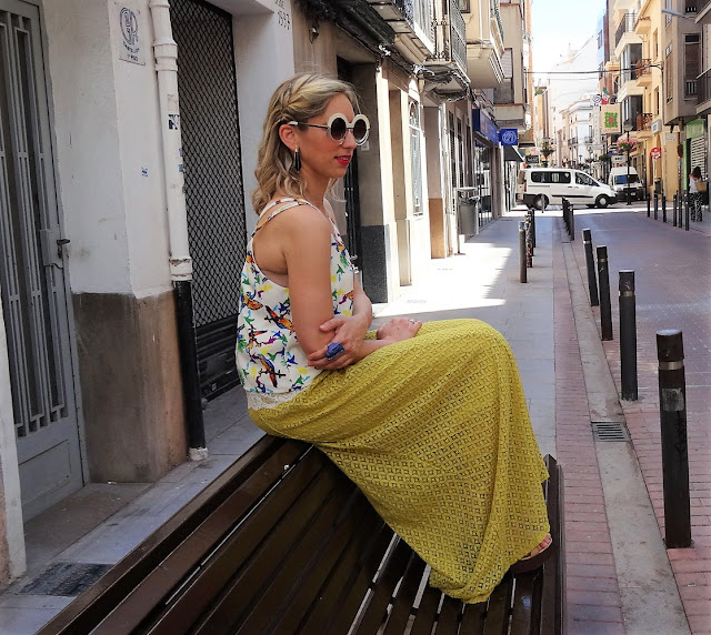 Se esta poniendo nuevamente de moda. Yo no había tenido aún ninguna en mi armario y esta en color mostaza, me llamo la atención. Lo quise conjuntar con una blusa estampada de diferentes colores y de complementos unas sandalias de cuña con tacón, para que estilice mas aún la falda pantalón. Llevo el anillo de Sargadelo y unas gafas muy retro, que me encantaron.